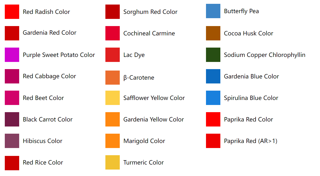 Colorants, also known as food coloring agents, are substances that primarily aim to color food and improve its color. There are currently over 60 commonly used food coloring agents in the world, which are divided into two categories based on their sources and properties: synthetic food coloring agents and natural food coloring agents. With the increasing awareness of food additive safety among people, vigorously developing natural, nutritious, and multifunctional natural colorants has become the development direction of colorants.